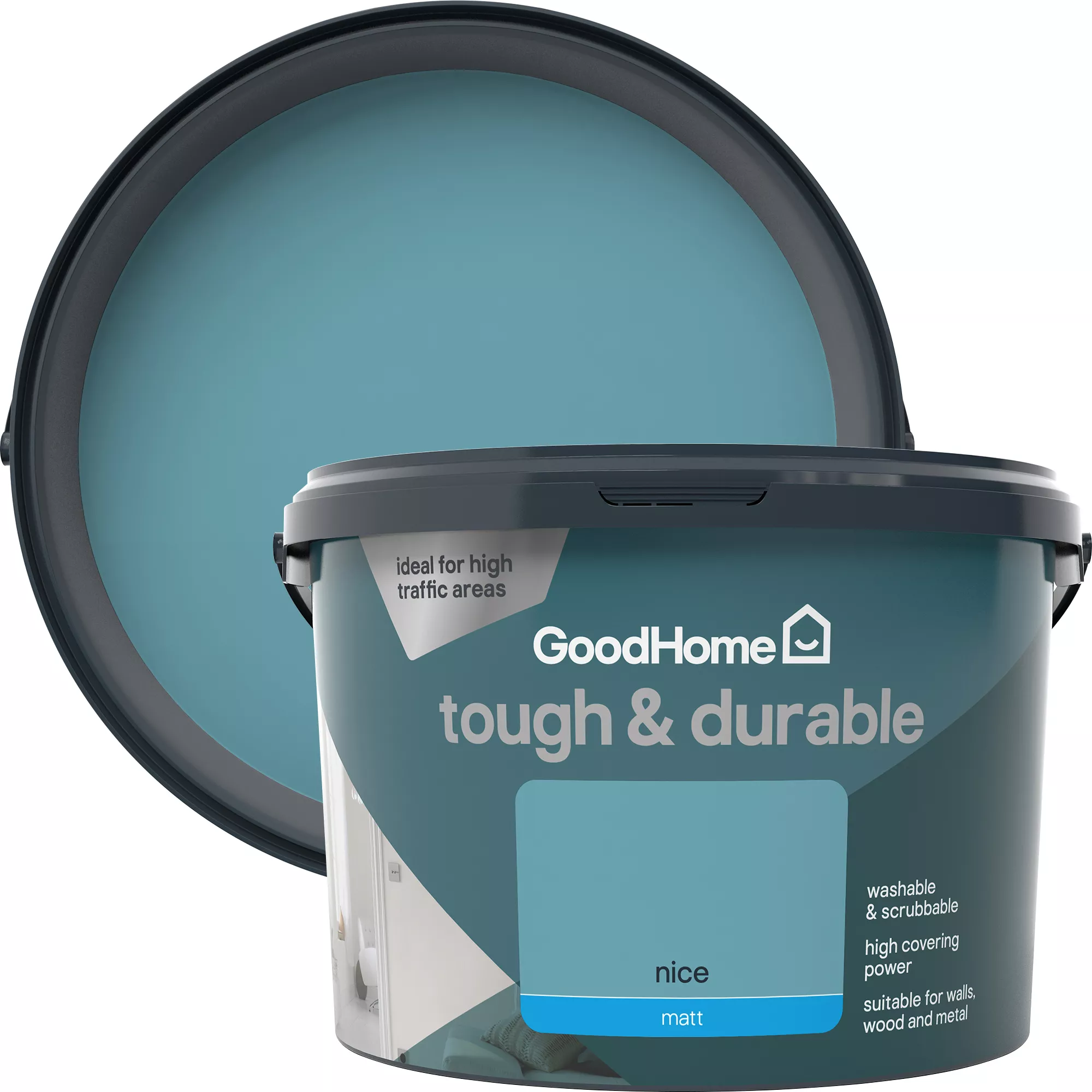 GoodHome walls and ceilings durable paint is suitable for walls, wood and metal with our toughest formulation and excellent covering power. It is extremely hard wearing so is ideal for hallways, stairwells and children’s bedrooms.